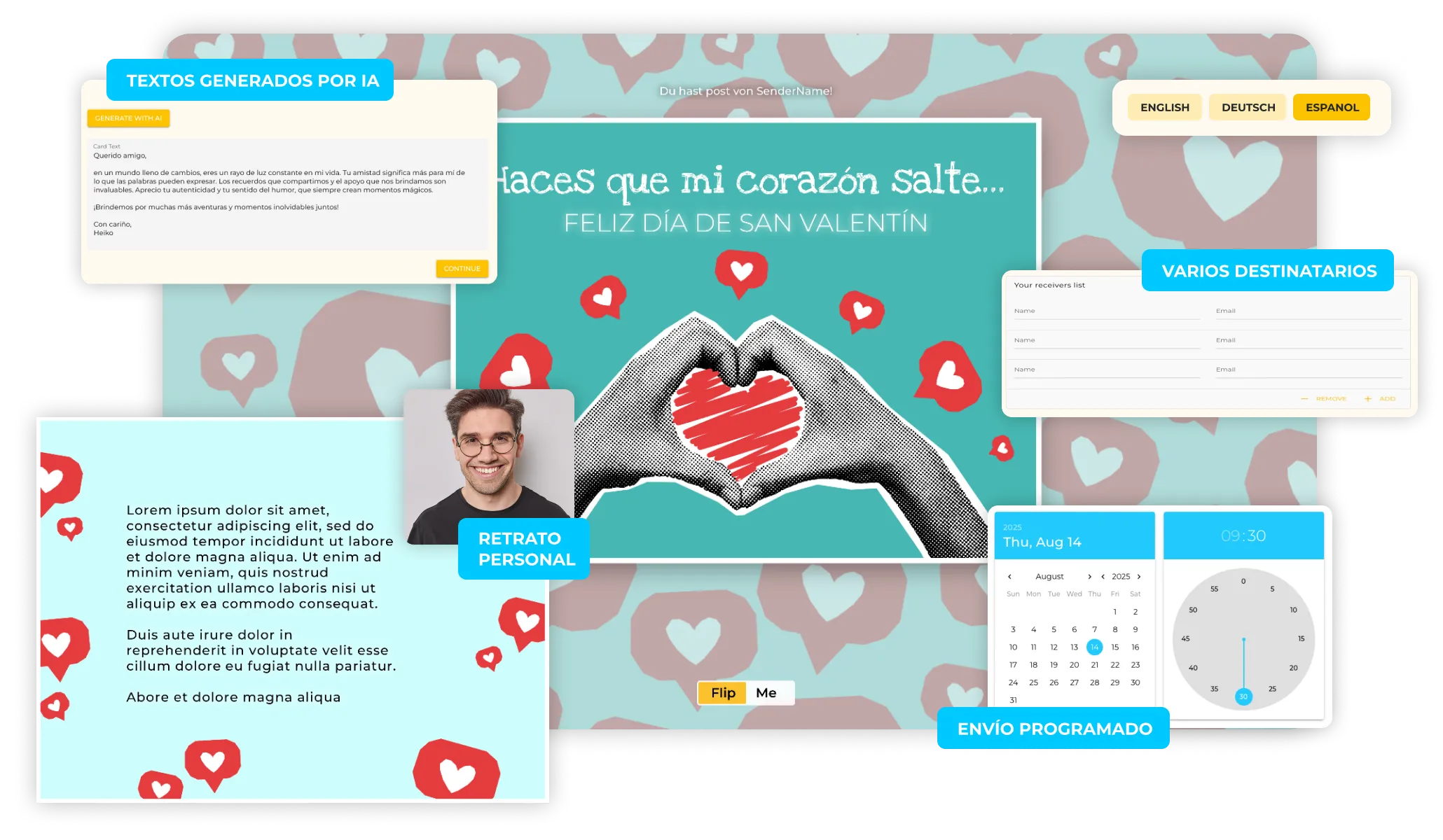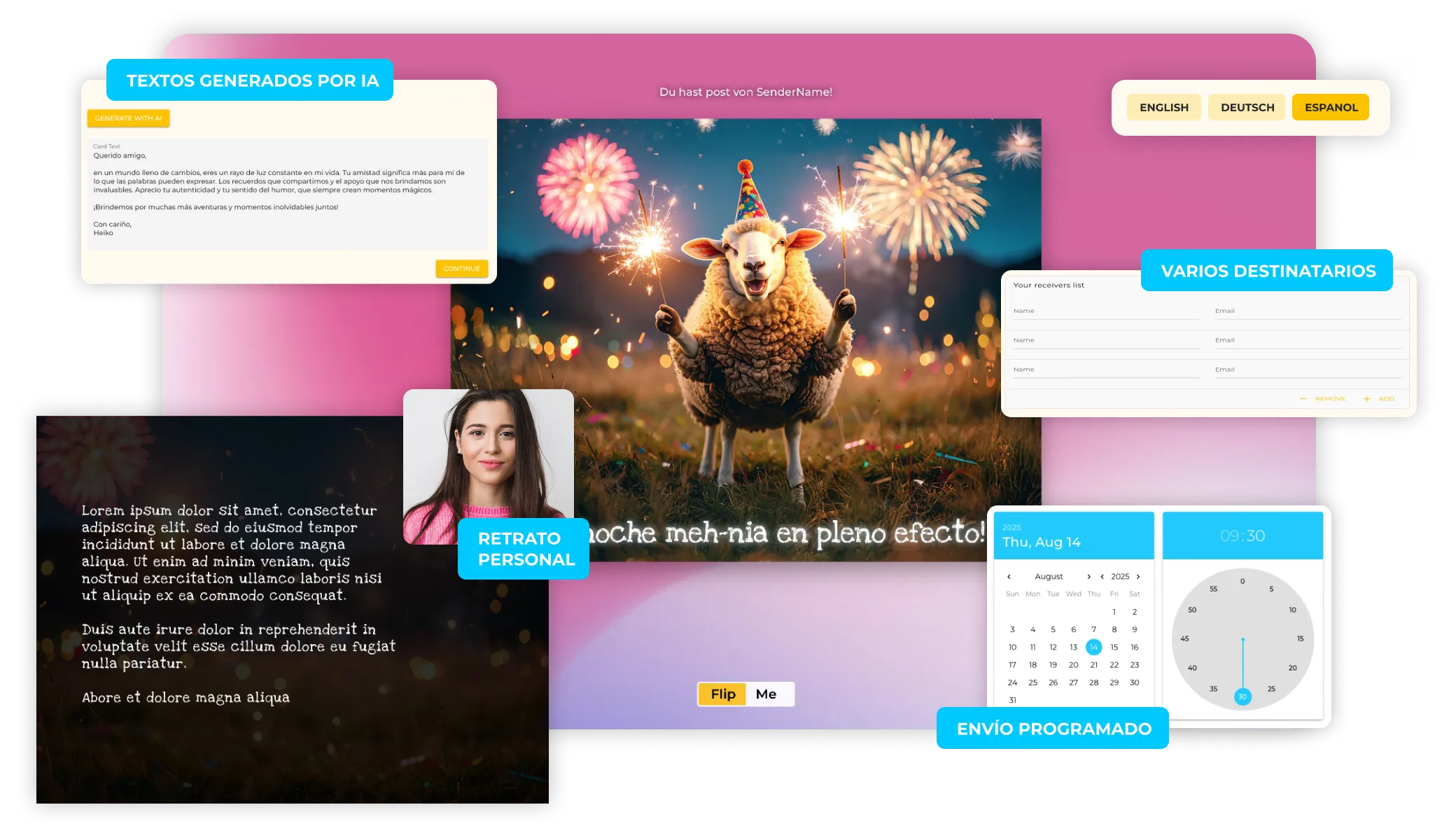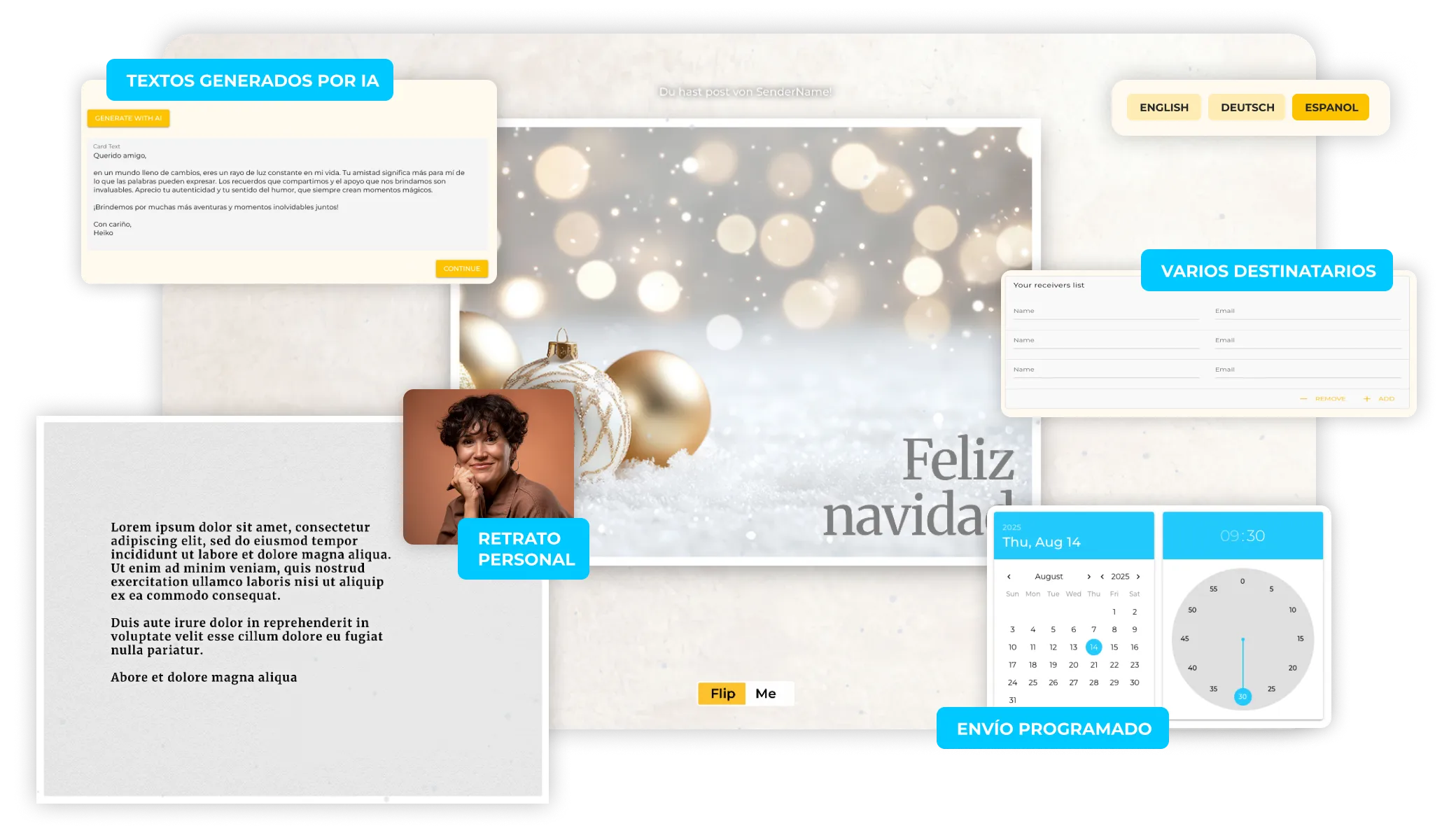 Ya sean alegres deseos de cumpleaños, tarjetas navideñas festivas, mensajes elegantes de Año Nuevo o notas románticas de amor — aquí encontrarás el diseño adecuado para hacer tu mensaje especial.
